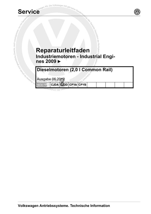 Vollständige Details anzeigenIndustriemotoren - Industrial Engines (IM) Reparaturanleitung Dieselmotoren (2,0 l Common Rail) CJDA CJDD CPYA CPYB